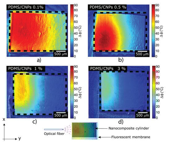 Figure 5a–d depict the steady-state temperature gradient of the materials after irradiation with the NIR diode laser for 300 s; all the nanocomposites reached a steady temperature profile after 90 s of irradiation. Figure 5a shows that the laser effectively interacted with the PDMS/CNPs 0.1% nanocomposite, penetrating approximately 2 mm and thus increasing the temperature up to 70–80 °C across the whole diameter of the cylinder. In contrast, a shorter penetration depth was observed for the PDMS/CNPs 0.5% cylinder (approximately 1 mm, see Figure 5b) owing to the increase in absorption. Notice, however, that the temperature reached an increase of almost 90 °C within a small localized region (0.5 mm diameter) of the cylinder. Meanwhile, the temperature profile of the PDMS/CNPs 1% shown in Figure 5c, exhibited a temperature increase of approximately 50–60 °C and a light penetration of nearly 1 mm. Finally, the nanocomposite with the highest concentration of CNPs (PDMS/CNPs 3%) showed the shortest laser light penetration (around 0.5 mm) and the lowest temperature increase (30–40 °C), as shown in Figure 5d.