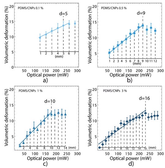 Volumetric deformation of the nanocomposites caused by NIR irradiation. The irradiation distances—used to obtain each point in the curves—are indicated in the inset axes: (a) PDMS/CNPs 0.1% showing a maximum deformation with an optimal distance equal to 5 mm; (b) PDMS/CNPs 0.5% showing a maximum deformation with an optimal distance equal to 9 mm; (c) PDMS/CNPs 1% showing a maximum deformation with an optimal distance equal to 10 mm; and (d) PDMS/CNPs 3% showing a maximum deformation with an optimal distance equal to 16 mm.