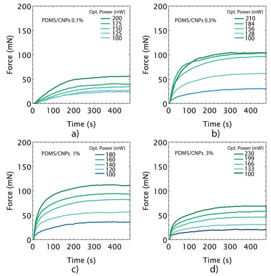 Optically driven forces produced by nanocomposites as a function of time for different optical power outputs: (a) PDMS/CNPs 0.1% considering an optimal distance d = 5 mm; (b) PDMS/CNPs 0.5% considering an optimal distance d = 9 mm; (c) PDMS/CNPs 1% considering an optimal distance d = 10 mm; and (d) PDMS/CNPs 3% considering an optimal distance d = 16 mm.