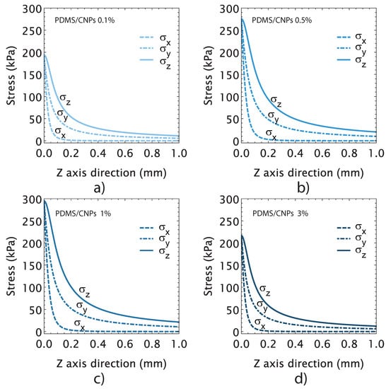 Following the concepts that are presented in Section 3.4.3, we evaluated the maximum stresses induced on the active elements in order to determine a conversion factor between the optical and mechanical energies. The plots in Figure 8 show the state of stress attained by the active cylinder for each nanocomposite. Unlike the free deformation experiments shown in Figure 6, for these experiments, the active cylindrical elements were placed between compression plates in order to determine the mechanical stresses induced by NIR irradiation. As shown in Figure 8a–d, the thermal expansion produced normal stress components in the x, y, and z-directions (, and ), as it was expected. The plots further show that the normal stresses decayed exponentially until vanishing, reaching a maximum value at the irradiation zone and decreasing at distances of the order of the radius of the cylinder. The maximum values of stresses were registered in the contact region—between the plates and the cylinder—yielding values of 194, 275, 295, and 216 MPa for the PDMS/CNPs 0.1%, PDMS/CNPs 0.5%, PDMS/CNPs 1%, and PDMS/CNPs 3% nanocomposites, respectively.