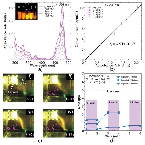 The drug delivery experiments were conducted only for the PDMS/CNPs 1% nanocomposites because it showed the best responses under NIR irradiation. Aside from providing the largest optically driven force (112 mN) and stress (295 MPa), this nanocomposite also showed a moderate increase in temperature (50–60 °C, in air), exhibiting one of the highest load rates (1.6 mNs) compared to the other nanocomposites. Figure 9 shows the performance of the capsule made of PDMS with a cylindrical active element of PDMS/CNPs 1% under pulses of NIR irradiation. Figure 9a shows the UV-Vis spectra of Rh-B dissolved in distilled water at different concentrations (1, 3, 5, 7, and 10 g·mL). These spectra were used to obtain a calibration curve through UV-Vis measurements considering the characteristic peak of Rh-B at 554 nm (see Figure 9a,b). After calibration, the drug delivery experiment was conducted using the optimal parameters of distance and optical power obtained for the selected nanocomposite.