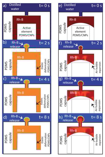 The main numerical results are shown in Figure 10a–d. In the first simulation (left column), we emulated the release of marker solution as a function of time (denoted with red color at t = 0) owing to the elastic thermal expansion of the PDMS/CNPs element activated by photothermal conversion. The sequence of images (up to 8 s) clearly show that the elastic deformation of the capsule can promote, by itself, the release of Rh-B initially contained inside the capsule. In addition, an interesting insight provided by the numerical results is that the release of Rh-B by such elastic mechanical stress occurs relatively fast and tends to stabilize or saturate after a certain time; this can be seen in Figure 10a, where the marker travels the orifice in around 1 s and then forms a spherical-like domain that does not grow significantly after that time period.