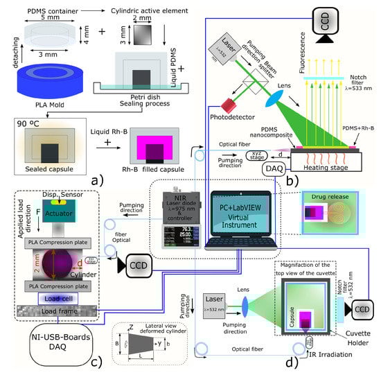 To fabricate the PDMS membranes and cylinders, the curing reagent was added in a 10:1 weight ratio, and each blend was subsequently mechanically mixed for 5 min. The cylindrical active elements were obtained upon pouring the PDMS/CNPs nanocomposites into PLA cylindrical 3D printed molds (2 mm internal diameter and 3 mm depth), while the membranes were obtained using Petri dishes to allocate blank PDMS. Both elements were cured at 90 °C for 2 h and after cooling, they were demolded and assembled concentrically in a Petri dish containing liquid PDMS (see Figure 11a). This arrangement was then finally cured at 90 °C for 2 h to obtain a sealed capsule ready to be filled with rhodamine B (Rh-B) for the drug delivery experiments.