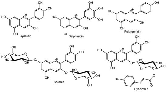 Anthocyanins are responsible for a flower’s colors, from pink to blue, but they are also present in leaves, fruits, and roots. They are prevalent in angiosperms, although their occurrence in gymnosperms has also been reported [15]. Anthocyanins are also recognized for their biological properties, which, together with their bright color, make them interesting additives for food preparations [16,17]. From a chemical point of view, and as mentioned above, anthocyanins are the anthocyanidins O-glycosides. Anthocyanidins (Figure 1), highly oxidized 2-aryl-3-hydroxychromenylium, are also colored pigments, although less stable, and consequently few examples are found in nature, the most widespread derivatives being cyanidin, responsible for red to magenta colors, delphinidin, responsible for purple to blue colors, and pelargonidin, responsible for orange to pink colors (Figure 2). This color differentiation may be associated with one of the main rules of these flavonoids in plants, which is to attract animals for pollination, and different colors attract different animals. In addition, the presence of a sugar moiety promotes some changes in color brightness. The most common sugar is glucose with a β-linkage, but galactose, rhamnose, and xylose are also found. Moreover, these sugar moieties can have acyl substituents, highlighting cinnamic acyl derivatives, such as caffeic, ferulic, and p-coumaric acids, due to these phenolic acid rules in plants’ antioxidant activity.