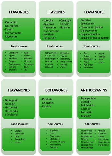 Both genetic and environmental factors exert an important role in the inflammation process. Several studies have demonstrated that an active lifestyle together with a healthy diet, rich in fruits and vegetables as well as non-processed and low-sugar foods, prevent inflammatory diseases [8]. Some flavonoids, such as flavonols (e.g., quercetin, rutin, and morin), flavanones (e.g., hesperetin and hesperidin), flavanols (e.g., catechin), isoflavones (e.g., genisten), and anthocyanins (e.g., cyanidin) have been demonstrated to exhibit anti-inflammatory functions during in vitro and in vivo experiments and in clinical studies [6,63].