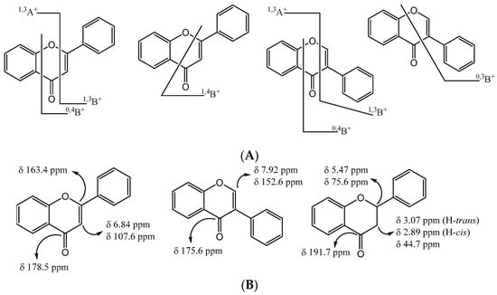 (A): The most important ion fragments of flavones and isoflavones. (B): The most important NMR signal nucleus.