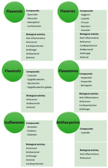 In addition to antioxidant properties, many other actions of flavonoids are described, such as anti-inflammatory, anticancer, cardioprotective, antimicrobial, and antiviral (Figure 8).