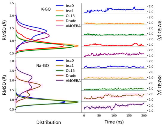 The RMSDs of backbone atoms (C3′, C4′, C5′, O3′, O5′, P) in K-GQ and Na-GQ during MD simulation with different force fields. The experimental structures were used as references. To show the results more clearly, the average RMSD value of every 100 snapshots is shown.
