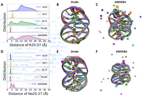 The distribution of distances between terminal ions and the comparison of experimental and simulated structures of GQ in replication 1. (A,D) are the distribution of distance between K25–K27 in K-GQ and Na25-Na27 in Na-GQ in MD simulations, respectively. (B–F) are alignments of experimental structures of K-GQ and Na-GQ with that were taken from MD simulations.