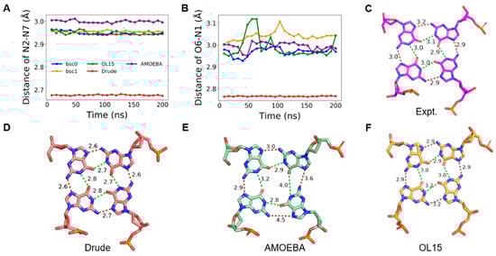 (A,B) are changes of hydrogen bond lengths in tetrad 1 during the MD simulation of Na-GQ. (C–F) are typical structures of tetrad 1 in experiment, and MD simulation with Drude, AMOEBA, and OL15, respectively. (A,B) share the same figure legend.