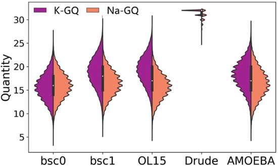 In addition, previous study [32] has observed bifurcated N1–N7 hydrogen bonds in the MD simulation. This kind of hydrogen bond is regarded as an artifact due to the inaccuracy of the force field. Therefore, we inspected the existence of bifurcated hydrogen bonds in our MD simulations (Table S3). For the Drude force field, encouragingly, we found that none such hydrogen bonds formed throughout the MD simulation of K-GQ, whereas they existed occasionally in sodium-containing GQ. For Amber force fields, the occupation ratios of bifurcated hydrogen bonds are more than 20% in Na-GQ. For the AMOEBA force field, bifurcated hydrogen bonds are formed with a very short lifetime in both GQs. From this part, one can conclude that the formation of bifurcated hydrogen bonds can be prevented by the inclusion of polarization effect.