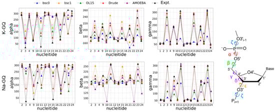 Average dihedral angle of guanine deoxyribonucleotides in replication 1 calculated from 20,000 snapshots randomly extracted from the MD trajectories of K-GQ (upper panel) and Na-GQ (bottom panel), respectively. The experimental values are also shown for comparison.