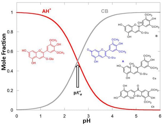 Anthocyanins belong to the family of flavonoids and comprise the largest group of pigments in the plant kingdom. They are responsible for blue, orange, violet, purple, pink, and red colors in many fruits, leaves, roots, seeds, stems, and flowers [,]. However, despite being generally represented in flavylium cation form (AH+), anthocyanins are involved in a series of reversible pH-dependent chemical reactions that comprise both the colored flavylium cation and the neutral quinoidal base (A) forms, as well as the colorless hemiketal and cis-trans-chalcones (B, Cc, and Ct; see Figure 1) [,]. The fact that these last colorless species are usually predominant at slightly acidic or neutral pH values strongly hampers more generalized applications of anthocyanins as alternative dyes. The flavylium cation (AH+) behaves as a weak acid; in sufficiently acidic mediums it is a unique species, while at higher pH conditions other species are formed (Figure 1) [,]. Despite the apparent complexity associated with this multistate system, considering it as a weak acid (AH+, with a global acidity constant pK’a) in equilibrium with a conjugate base (CB, where [CB] = [A] + [B] + [Cc] + [Ct]) greatly simplifies its quantitative analysis. Amongst the CB species only the quinoidal base (A) is colored, but its contribution to CB is minor. In the specific case of the most common anthocyanins, B is often the most abundant species of CB, with A, Cc, and Ct present in significantly lower amounts []. Furthermore, because the formation of the trans-chalcone (Ct) in anthocyanins is a very slow process, it is possible to define a pseudo-equilibrium between AH+ and CB^, with [CB^] = [A] + [B] + [Cc], where no significant amounts of Ct are formed (pK^a) []. Nevertheless, when the molar fraction of Ct at the equilibrium is very low pK^a ≈ pK’a, which is often the case for common anthocyanin [].