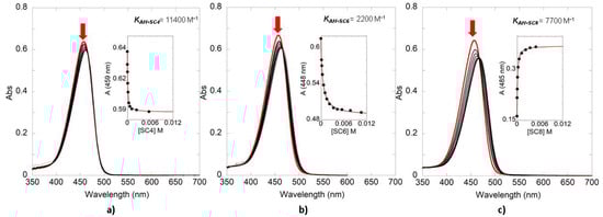 The insets in Figure 2 plot the variation of the absorbance at a single wavelength against the concentration of macrocycle. These data can be fitted using a host-guest binding model to obtain the respective association constants () of SC4, SC6, and SC8 with the guest 4′7-DHF. Equation (1), reported by Oliveira and colleagues [] for the co-pigmentation effect, can be used to fit the UV-Vis data obtained after titration with the hosts (see Electronic Supplementary Information ESI for details).