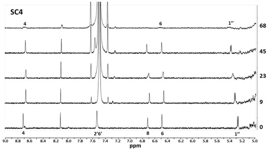 1H NMR spectroscopy is a powerful tool to identify the binding sites in the structure of the SCn and phenolic compounds complexes, analyzing the complexation-induced changes in the chemical shifts (Δδ) of the guest protons [,,]. The protons with the largest Δδ are mostly affected by the ring current effect of the aromatic nuclei in the SCn macrocycles. In this sense, 1H NMR experiments for the complexes 4′7-DHF-SCn were conducted at pD = 1 in D2O. (Figure 4) shows the 1H NMR spectra of a solution with a fixed concentration of 4′7-DHF and increasing concentrations of the host SC4. The guest molecule experiences a significant complexation-induced shift owing to the ring current effect of the aromatic nuclei of the SC4, indicating the encapsulation of the 4′7-DHF guest into the host cavity. The most affected 1H NMR signals, after complexation with the host molecule, are the H3, H4, H5, and H6, located around the A and C rings in the flavylium backbone. The H4 and H6 signals seem to be the more affected than the protons around the B ring. The fast/medium exchange dynamics between the free and complexed guest produce a broadening of some proton signals in the 1H NMR spectra, as frequently observed for the association of guest molecules with sulfonated calixarenes [,].
