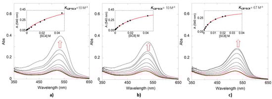 The pH-dependent stability of the Oenin flavylium cation was investigated at pH values above pH = 1. In the case of the anthocyanins, the flavylium cation reaches the pseudo-equilibrium in a few seconds or hours depending on the final pH, producing the conjugate base species (CB^) [,]. Due to the binding properties of the SCn to selectively recognize cationic organic molecules, the flavylium species can be expected to form host-guest complexes with higher affinity than the CB^ species. The calculation of the apparent association constant of the CB^ species with the macrocycles can be determined from host-guest titrations at slightly acidic pH values. Titration of pseudo-equilibrated solutions at pH ≈ 3.5 were performed, where the molar fraction of the Oenin AH+ was around 10% []. Figure 6 shows the UV-vis spectra obtained after titration with SC4, SC6, and SC8. As can be observed, the visible absorption band assigned to the flavylium cation increases as the concentration of SCn is augmented because of the higher stability of these complexes. The insets show the plot of absorbance, at a specific wavelength, plotted against the concentration of macrocycle and the respective data fitting using Equation (2) []: