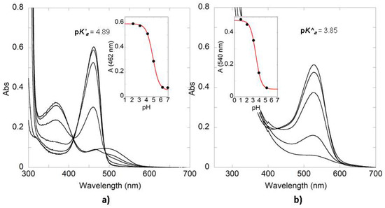 UV-Vis spectral variations of equilibrated and pseudo-equilibrated solutions obtained after direct pH jumps from pH=1 to higher pH values (citrate buffer 0.01M). (a) 4′7-DHF (1.15 × 10−5 M) in presence of SC4 46 mM and (b) Oenin (1.7 × 10−5 M) in presence of SC8 6.5 mM. The insets show the fitting for the calculation of pK’a or pK^a.