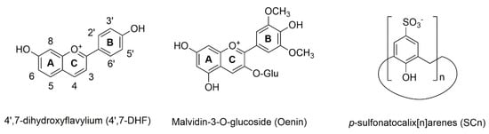 SCn macrocycles are provided with an aromatic binding pocket decorated with SO3− groups in the upper rim, being particularly suitable for the binding of positively charged guests that can be stabilized by different interactions such as ion-pairing, cation-π, π-stacking, CH-π, and hydrophobic effects [,]. In a previous work, we demonstrated the formation of the photo-responsive host-guest complexes between flavylium-based photo switches and SC4 []. On account of the high binding constants observed for selective complexation of synthetic flavylium compounds, in this work we report the results of our studies on the complexation and color stabilization of a synthetic flavylium cation and a natural anthocyanin with SC4, SC6, and SC8 (Scheme 1).