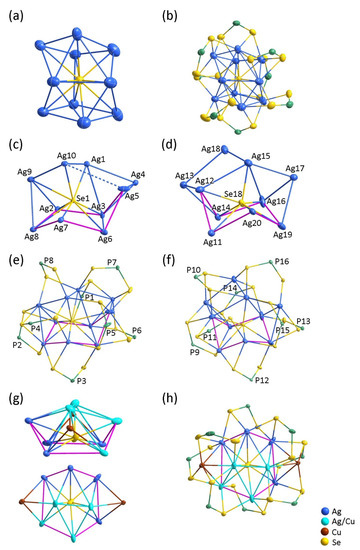 - Nayek, H.P.; Massa, W.; Dehnen, S. Presence or absence of a central Se atom in silver selenide/selenolate clusters with halite topology: Syntheses and properties of [(Ph3PAg)8Ag6(μ6-Se)1-x/2(SePh)12]x+ (x = 0, 1). Inorg. Chem. 2010, 49, 144. [Google Scholar] [CrossRef]
