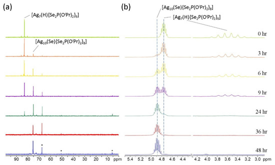 (a) Time-dependent 31P{1H} and (b) 1H NMR spectrum of the reaction acquired from 0 to 48 h (asterisks denote the fragments of dsep ligands after decomposition).