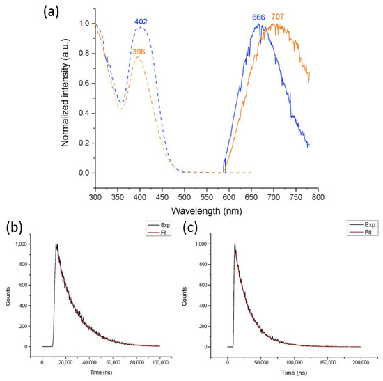 (a) The absorption spectrum of 2 (blue dashed line) and 3 (orange dashed line). The emission spectrum of 2 (blue solid line) and 3 (orange solid line) dissolved in 2-MeTHF at 77K. (b) The photoluminescence decay curves of 2 (λex = 401 nm) and (c) 3 (λex = 396 nm) in 2-MeTHF glass recorded at 77 K.