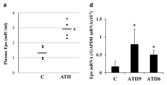 ATII administration increased the plasma Epo concentration from 1.4 ± 0.2 to 2.9 ± 0.3 mIU/mL (Figure 1a).