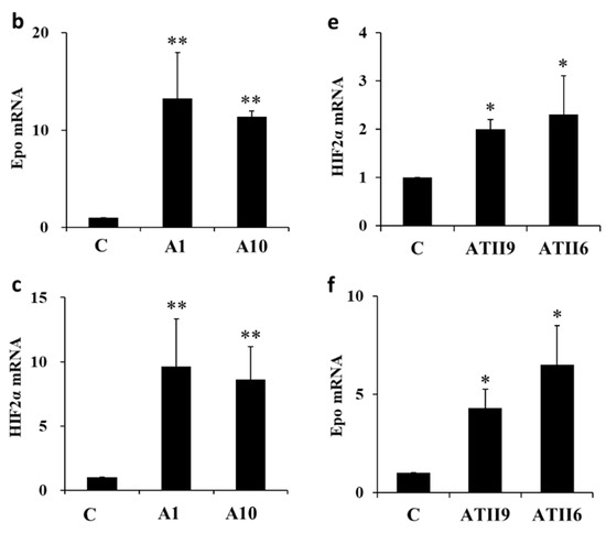 Epo mRNA expression. (a) Plasma Epo concentration in control and ATII-injected rats. ATII significantly increased the plasma Epo concentration from 1.4 ± 0.2 to 2.9 ± 0.3 mIU/mL (* p < 0.05). (b,c) ATII significantly increased Epo mRNA expression in the renal cortex (13.2 ± 4.7 and 11.4 ± 0.6 times increase by A1 and A10, respectively) (b), and HIF2α mRNA expression was also stimulated by ATII (9.6 ± 3.7 and 8.6 ± 2.6 times increase by A1 and A10, respectively) (c). (d–f) In microdissected nephron segments, ATII increased Epo mRNA expression in PCT (d) and MAL (f). HIF1α mRNA was also increased by ATII in PCT (e). C, control; A1, ATII 1 mg/kg; A10, ATII 10 mg/kg; ATII9, AT2 10−9 M; ATII6, ATII 10−6 M. * p < 0.05, ** p < 0.01 by the t-test or a non-parametric analysis using the Kruskal–Wallis test and multiple comparisons by the Dunnett or Shirley–Williams’ test.