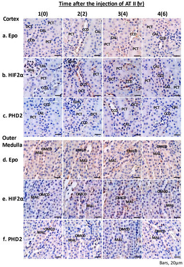 Epo mRNA expression was observed in cortical nephrons under basal conditions, as previously reported [19]. ATII stimulated Epo mRNA expression in PCT, MAL, and cortical and medullary collecting ducts (CCD and OMCD) after 2 h (Figure 2: 2a, 2d). HIF2α mRNA expression increased in most nephron segments and peritubular cells of both the cortex and the medulla (Figure 2: 2–4b, 2–4e). PHD2 mRNA expression also increased in MAL, CCD, and OMCD (Figure 2: 3–4c, 3–4f). ATII failed to induce Epo mRNA expression in the peritubular cells of the renal cortex.