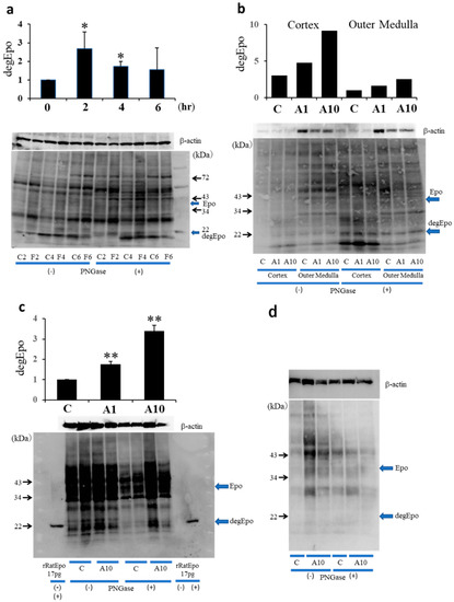 Erythropoietin (Epo) stimulates erythrocyte production in the bone marrow [1]. Hypoxia and anemia stimulate Epo production by the kidney [1,2,3,4]. Severe hypoxia and severe anemia cause more than a 500-fold increase in the serum Epo concentration [5]. However, such conditions are rare and most people do not experience them during their lives. The serum Epo concentration in normal people is low, and Epo protein expression in control kidneys has been too low to detect [5,6,7,8]. We developed a new Western blotting method and found that deglycosylated Epo is an accurate marker of Epo expression [5,9]. Epo protein in the kidney is detected at 34–43 kDa, and deglycosylation using PNGase shifts the band to 22 kDa. The broad Eoo band is concentrated to a narrow 22 kDa band, which results in an increase in detection sensitivity by 10–100-fold [5,9]. Thus, the detection of small changes in Epo production has become possible.
