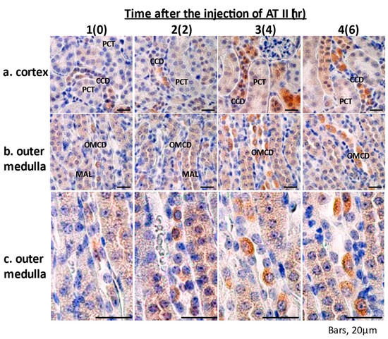 By IHC of mice, under basal conditions, Epo staining was found from the proximal tubules to the collecting ducts (proximal tubules < thick ascending limbs < collecting ducts) (Figure 4). ATII increased Epo production in PCT, MAL, CCD, and OMCD after 4–6 h (Figure 4; 3a, 3b, 3c, 4a, 4b and 4c). In the collecting duct, Epo expression was detected only in the type A intercalated cells, as previously reported (brown cells in Figure 4; 3c and 4c) [7,19]. Epo staining was not detected in peritubular cells under these conditions.