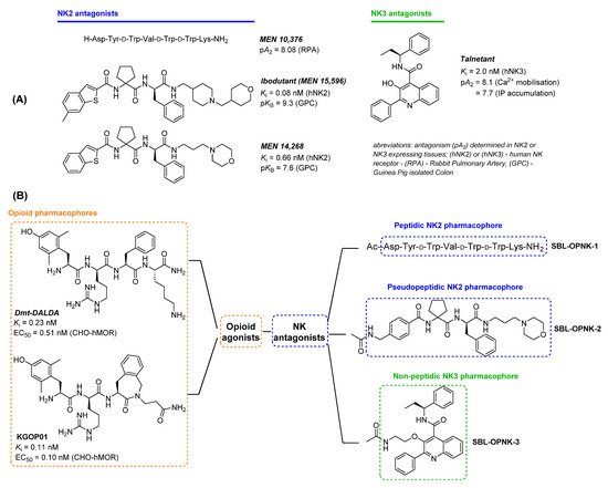 (A) Selection of high affinity neurokinin NK2 and NK3 antagonists with peptidic, pseudopeptidic, and non-peptidic scaffolds. (B) Design of opioid agonist–NK2/NK3 antagonist hybrids and molecular structure of composing pharmacophores.