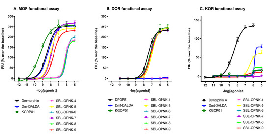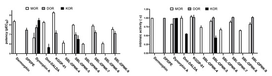 In the calcium mobilization assay, all compounds were assessed under the same experimental conditions and their effects were compared to the reference compounds: dermorphin, DPDPE, and dynorphin A for MOR, DOR, and KOR, respectively (Table 2 and Figure 3 and Figure 4).