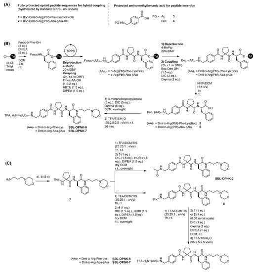 Peptide-based pharmacophores Dmt-DALDA, KGOP01, and SBL-OPNK-1, and peptide-based hybrids SBL-OPNK-4 and SBL-OPNK-5 were synthesized following standard solid phase peptide synthesis (SPPS) procedures on rink amide resin to obtain C-terminal carboxamides (not shown). Hybrid compounds SBL-OPNK-6 and SBL-OPNK-7 were synthesized either by first building the linear peptide scaffold on 2-chloro-trityl chloride resin, following standard SPPS, cleavage from the resin, and final coupling of 3-morpholinopropylamine in solution (Scheme 1B), or by sequential solution-phase couplings starting from 3-morpholinopropylamine (Scheme 1C). In this strategy, fully protected Boc-Dmt-d-Arg(Pbf)-Phe-Lys(Boc)-OH 1, and Boc-Dmt-d-Arg(Pbf)-Aba-βAla-OH 2 (Scheme 1A) were first synthesized by SPPS, as reported elsewhere [28]. For both strategies and when necessary, commercially available 4-(aminomethyl)benzoic acid, and cycloleucine were adequately N-protected following standard procedures, before their insertion (Scheme 1A and Supplementary Materials).