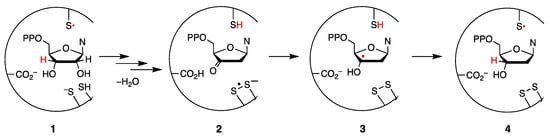 The radical chemistry associated with thiols (RSH) and disulfides (RSSR) plays important roles in nature, particularly in enzymes and proteins. One example is the conversion of ribonucleosides to 2′-deoxyribonucleosides, the monomers required for the construction of DNA, catalyzed by radical enzymes called ribonucleoside reductases (RNRs). There are three forms of the enzyme (classes I, II, and III) that are active in different species, with the former being active in eukaryotes and microorganisms, using ribonucleotide diphosphates as substrates [8,9,10]. An intriguing step in class I is the transfer from the tyrosyl radical to the thiol moiety in the active site where the ribonucleotide substrate waits for the conversion. Figure 1 summarizes the complex mechanism of this transformation, which initially involves a reversible 3′-hydrogen atom abstraction by the thiyl radical generated from the cysteine residues in the active site (1). There follows the elimination of water with translocation of the radical center to C2′ and quenching of the newly formed C2′ radical by another cysteine residue (2). This generates the disulfide radical anion (RSSR•−) that reduces the 3′-ketodeoxynucleotide (2→3) [11,12]. To complete the cycle, the C3′ radical abstracts the hydrogen from the initial cysteine residue (3→4). The restoration of the two cysteine residues occurs by the intervention of thioredoxin reductase (TRR) and NADPH [8].
