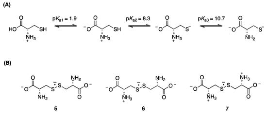 (A) The structure of cysteine, CysSH, and associated pKa values; (B) Disulfide radical anion of cysteine (CysSSCys)●− with 0 (5), 1 (6), and 2 (7) protonated amino groups.