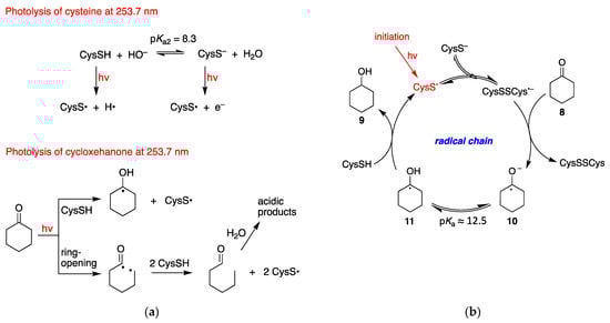 Based on the concentration of cyclohexanone and cysteine as well as their molar absorption coefficients, the light of 253.7 nm is absorbed by approximately 50% by each substrate. Light absorbed by the thiol/thiolate affords the thiyl radical together with H•/e− (Figure 3a) [22]. Light absorbed by the cyclohexanone affords the S1 (n,π*) or T1 (n,π*) excited states. The T1 state can react with thiol [23], whereas both S1 and T1 states are reported to lead to a classical type I cleavage (ring-opening) [24,25], and we suggest that this biradical intermediate can react with thiol (Figure 3a).