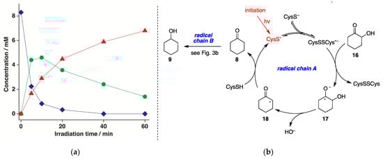 Photolysis (low-pressure Hg lamp, 5.5 W) of N2-saturated aqueous solutions of 2-hydroxycyclohexanone 16 (8.3 mM) containing CysSH (18.3 mM) was carried out for different times (up to 60 min) at pH 10.6. Cyclohexanone (8) and cyclohexanol (9) were formed as the only products. Figure 5a displays a graph with the disappearance of 16 (♦) and the formation of 8 (●) and 9 (▲) as a function of the reaction time, showing clearly that the reaction 16→9 occurs stepwise. The loss of 16 quantitatively matched the formation of 8 and 9, with 17% and 82% yields, respectively, after 60 min. The mechanism is depicted in Figure 5b based on a dual radical chain process, starting from the reaction of (CysSSCys)•− with 16 to produce the ketyl radical anion 17. This species undergoes α,β-C−O scission and HO− elimination, with the shift of the radical center to produce 18 [27], which completes the catalytic cycle by reacting with CysSH regenerating CysS•. The so-formed cyclohexanone (8) undergoes a second radical chain reaction, as described in Figure 3b.