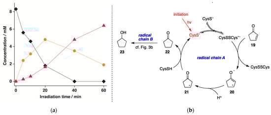 The reduction of 2-cyclopenten-1-one (19) was also explored under identical experimental conditions. The time profile of the reduction of (19) at pH 10.6 is reported in Figure 6a. In all experiments, cyclopentanone (22) and cyclopentanol (23) were formed as the only products, and again, the disappearance of 19 (♦) and the formation of 22 (●) and 23 (▲) as a function of the reaction time showed clearly that the reaction 19→23 occurs stepwise. The loss of 19 quantitatively matched with the formation of 22 and 23, with 23% and 77% yields, respectively, after 60 min. The mechanism depicted in Figure 6b is based again on a dual radical chain process, starting from the single-electron transfer from (CysSSCys)•− to 19 give the allyl-type radical 20. This species undergoes protonation from the aqueous medium with double-bond shift to produce 21, which completes the first catalytic cycle by reacting with CysSH regenerating CysS•. The so-formed cyclopentanone (22) undergoes a second radical chain reaction analogous to the one reported for cyclohexanone in Figure 3b.