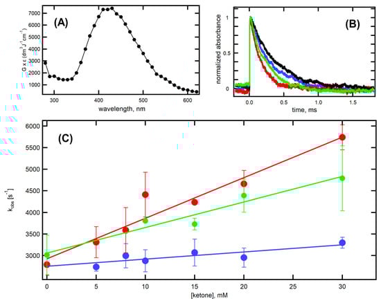 Transient absorption spectrum of (CysSSCys)●− in the range 280–620 nm recorded 10 µs after the electron pulses is shown in Figure 7A, with the absorption maximum at 420 nm and in accord with previous reported ones [35]. The black traces in Figure 7B represent the decay of transient absorption at λmax = 420 nm recorded after the electron pulse. The rate of decay of (CysSSCys)●− was investigated by varying the concentrations of a ketone from 0 to 30 mM. We selected three ketones: cyclohexanone (8), 2-hydroxycyclohexanone (16), and cyclopentenone (19) for the time-resolved studies. The decay kinetics at various concentrations of 8, 16, and 19 were recorded at λmax, as shown in Figure 7B, for the presence of 30 mM of 8 (blue), 16 (green) and 19 (red). The pseudo-first-order rate constants of the decay of 420 nm absorption band were plotted as a function of ketone concentration (Figure 7C).