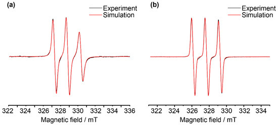 Electron paramagnetic resonance (EPR) spectra and appropriate simulations of (a) 0.1 mM sRL2 (molar ratio of spin label 1 to RL22: 3.5) in an aqueous solution, pH 5.5; (b) 0.2 mM radical 2 in 50 mM phosphate-buffered saline (PBS), pH 7.2. The spectra were acquired at 35 °C with the following parameters: microwave frequency (a) 9.231393 GHz, (b) 9.230876 GHz; (a,b) microwave power 2.0 mW; (a,b) sweep time 30.01 s, (a,b) time constant 20.48 ms, (a,b) conversion time 29.31 ms, (a,b) 1024 points, with the number of scans 4 (a) and 16 (b). In both cases, the external magnetic field was modulated at frequency 100 kHz and modulation amplitude 0.2 mT. Simulations were done in the slow-motional regime [54,55], and parameters of the simulations are given here. g = (2.0091 2.0059 2.0018) (a,b); hyperfine splitting constants: (a) AN = (0.30 0.30 4.00) (mT), and (b) AN = (0.30 0.30 4.08) (mT); line width: (a) (Gaussian 0.346, Lorentzian 0.0019), (b) (Gaussian 0.318, Lorentzian 0.042); Correlation times: (a) τc = 2.77 × 10−1 ns, (b) τc = 4.1 × 10−2 ns.