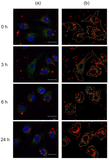 Representative confocal images of fRL2 in A549 cells and the processing of the images are shown in Figure 5. The red objects outside the cells are fRL2 attached to the dish surface; they could not be washed off with PBS. As one can see, the red objects inside the cells vary considerably in size. The calculation results on the fRL2 particle number are presented in Table S2. Red signals overlapped with green ones in less than half of the cases. We believe that in the first hours after the cell incubation, a significant portion of fRL2 can be found in early endosomes, which are invisible because of their neutral pH because LysoSensor Green DND-189 accumulates only in acidic organelles. Nonetheless, even at 6 and 24 h from the end of the cell incubation, when endosomes have had enough time to mature, some fRL2 molecules are not in endosomes. This result might be due to endosomal leakage or direct penetration of RL2 bypassing endosomes. This finding is consistent with our earlier study on the influence of different endocytosis inhibitors on fRL2 penetration into cells: RL2 penetrates cells mostly by lipid raft-mediated endocytosis, but none of the endocytosis inhibitors completely suppress its penetration, indicating that RL2 can also penetrate the cells by a mechanism that is an alternative to endocytosis [49]. Thus, we can conclude that RL2 is localized in endosomes and in the cytoplasm of A549 cells after their incubation with RL2.