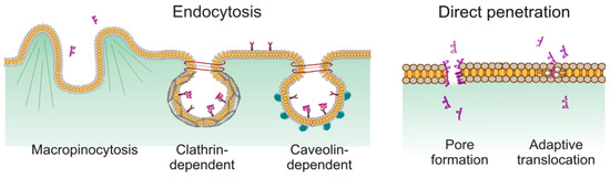 A number of cell-penetrating peptides (CPPs) are known for their effective penetration and their ability to deliver cargo molecules into a cell. The mechanism of cellular uptake of CPPs is still not well understood, although it is a subject of many studies [40,41]. It is assumed that this uptake can occur via either endocytosis or direct penetration (Scheme 2) [42,43,44]. The main pathway of macromolecule penetration into a cell is endocytosis: adenosine triphosphate (ATP)-dependent transport of macromolecules. It enables recirculation of receptors and lipids, destruction of foreign substances, and uptake of nutrients that cannot passively diffuse through pores in the plasma membrane into a cell. Taken up molecules are internalized by the cell via vesicles. Endocytosis includes phagocytosis (which is more specific for immune cells, e.g., phagocytes), macropinocytosis [45] (uptake of large amounts of fluids driven by rearrangements of filamentous actin), and receptor-mediated pinocytosis [46,47] (e.g., clathrin-dependent or caveolin-dependent), which differ in endosome morphology and the proteins involved in the uptake process (Scheme 2).