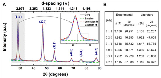 (A) Fitting of the part-CaF2 XRD pattern. (B) Peak assignment regarding positions and interplanar distances compared with the literature (JCPDS Card no 87-0971).
