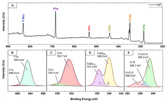 X-ray photoelectron spectra of part-CaF2. (A) Survey spectrum confirming the main characteristic atomic components. (B) F1s deconvolution. (C) O1s deconvolution. (D) Typical Ca2p spin-orbit splitting for Ca(II). (E) Chemical environment of the C1s peak.