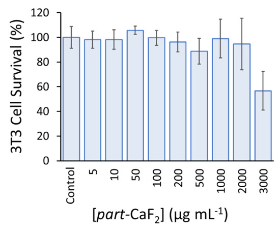 The in vitro toxicity of various concentrations of part-CaF2 against 3T3 fibroblasts was studied via MTT assay (Figure 5). Compared to the control group, the 3T3 fibroblasts maintained their full viability (90–100%) for part-CaF2 concentrations of up to 2000 µg·mL−1 and 60% at the highest tested concentration (3000 µg·mL−1). These results highlight the excellent biocompatibility exhibited by these particles, making them suitable candidates for numerous applications in the biomedical field.