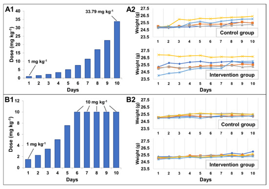 (A1) First MTD methodology for part-CaF2. The doses were incremented by no more than 50% from the initial dose over 10 days. (B1) Second MTD methodology for part-CaF2. The doses were doubled every day starting at 1.00 mg·kg−1. (A2,B2) For both methodologies, the weight loss was monitored for the control and intervention groups of 5 mice each.