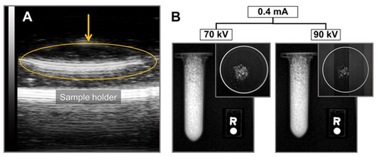 (A) Ultrasound imaging showing part-CaF2 suspended in water (orange arrow). (B) X-ray image showing a 2 mL Eppendorf tube filled with part-CaF2 and a top view of powder dispersed into a petri dish subjected to different potential and the same current intensity.