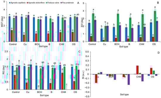 Selected germination indexes of grass seeds ((A)—MGT—mean germination time, (B)—SVI—seed vigor index, (C)—RG—rate of germination, (D)—RI—contamination soil effect response index) on various modifications of soil contaminated with copper; Cu—copper soil, copper soil with sorbents: BCH—biochar, B—bentonite, ChM—chicken manure, OS—organo-zeolitic substrate; mean values (n = 5; ± SD) marked with different letters (within each species) differ significantly according to Duncan’s test with p ≤ 0.05.