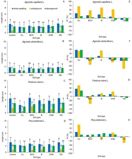 Length of grass seedlings germinated on various modifications of soil contaminated with copper; Cu—copper soil, copper soil with sorbents: BCH—biochar, B—bentonite, ChM—chicken manure, OS—organo-zeolitic substrate; mean values (n = 5; ± SD) expressed in (cm): (A)–(D) and in % of control: (E)–(H), marked with different letters (within each of the grass species) differ significantly according to Duncan’s test with p ≤ 0.05.