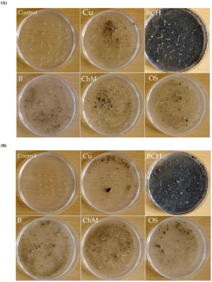 The sandwich method was used to analyze the effect of copper-contaminated soil and sorbents added according to Fujii et al. []. An 0.75% agar aqueous solution was prepared from powdered agar (Chempur, Poland) and autoclaved at 121 °C for 15 min. Sterile agar was poured 5 mL into sterile Petri dishes (the first layer of "sandwiches") and allowed to solidify at room temperature. A total of 0.5 g of Cu soil or Cu soil mixed with sorbents was poured onto the solidified first surface of the agar, in the proportion given in Table 1. After the soil was evenly spread on the Petri dishes, they were poured with 5 mL of agar, which was the second layer of the "sandwich", and allowed to solidify. The control group were Petri dishes with 10 mL of agar. The experiment for each type of soil and control was carried out in 5 repetitions.